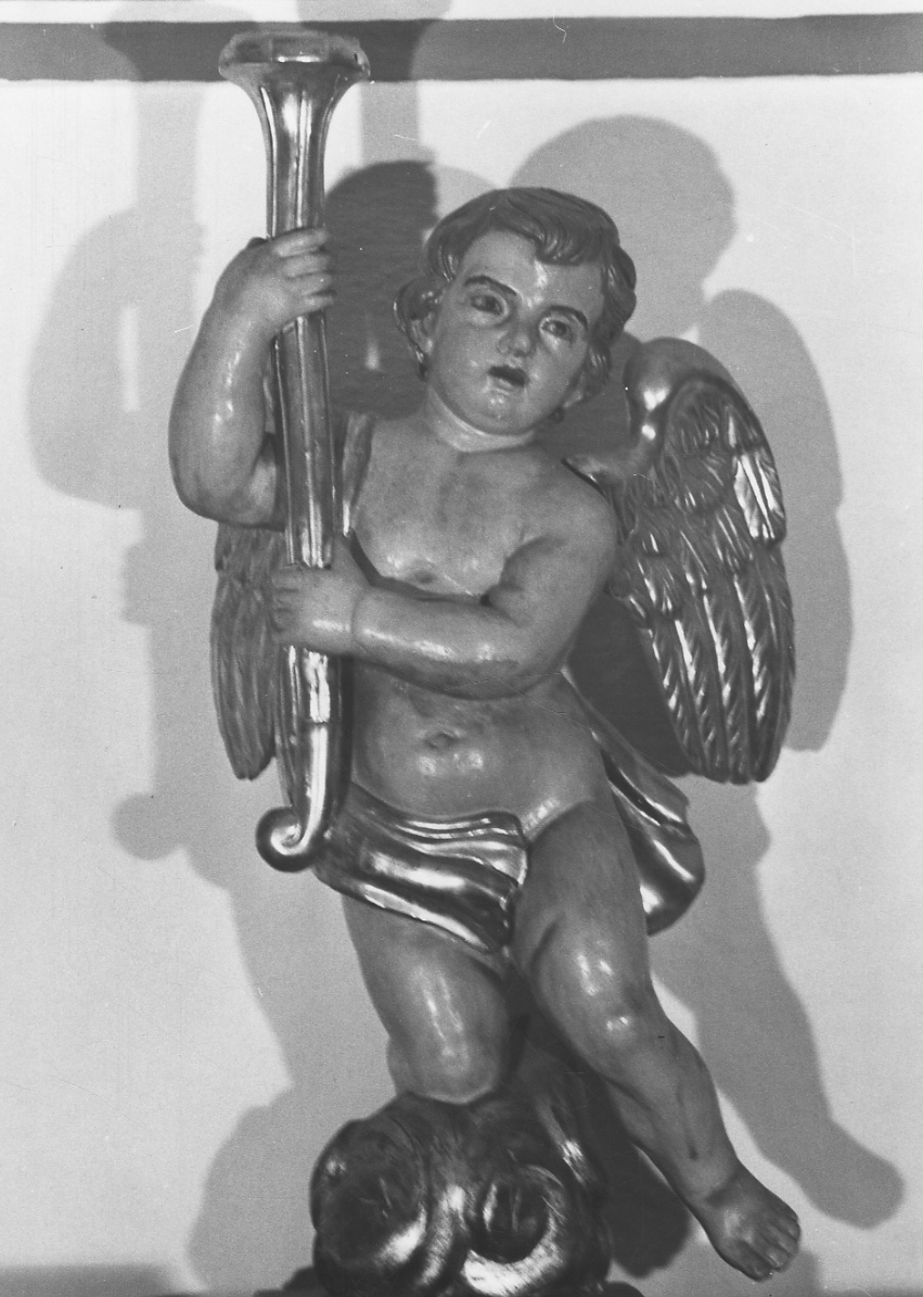 L'angelo poggia con un ginocchio su una piccola nuvola argentata. Con entrambe le mani regge una sorta di cornucopia rovesciata, scanellata e dorata, che funge da reggicero. I capelli sono corti, mossi, con un ciuffo che scende sulla fronte. Un drappo, variamente panneggiato, è appoggiato sulla spalla destra e scende morbidamente per coprire le parti intime. Le ali abbassate hanno piume ben delineate e sono dorate. Curato è il trattamento dei capelli e del volto, mentre l'anatomia del corpo è alquanto sommaria. L'angelo è scolpito a tutto tondo ed è stato completamente ridipinto.. Soggetti sacri. Figure: angelo. Oggetti: torcia