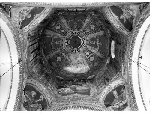 In primo piano, su soffici nubi, sono raffigurati due angeli che sembrano sostenere la figura di San Giovanni Nepomuceno in vesti ecclesiastiche, inginocchiato su nuvole ed in atto d pregare. Due angioletti gli sorreggono le braccia.. Soggetti sacri. Personaggi: San Giovanni Nepomuceno. Figure: angeli. Vesti ecclesiastiche. Abbigliamento religioso