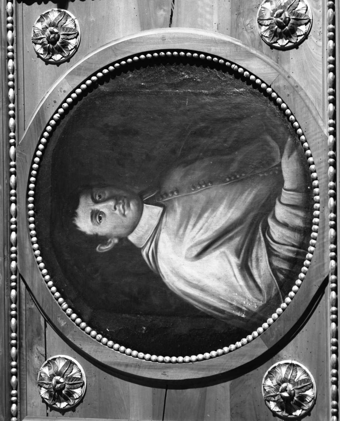 Il personaggio è rappresentato in età giovanile. Indossa una mantelletta bianca. Ha capelli neri. Lo sguardo è rivolto all'osservatore. Fondo scuro.. Personaggi: Padre Romano Merighi. Abbigliamento: (Padre Romano Merighi) mantelletta bianca