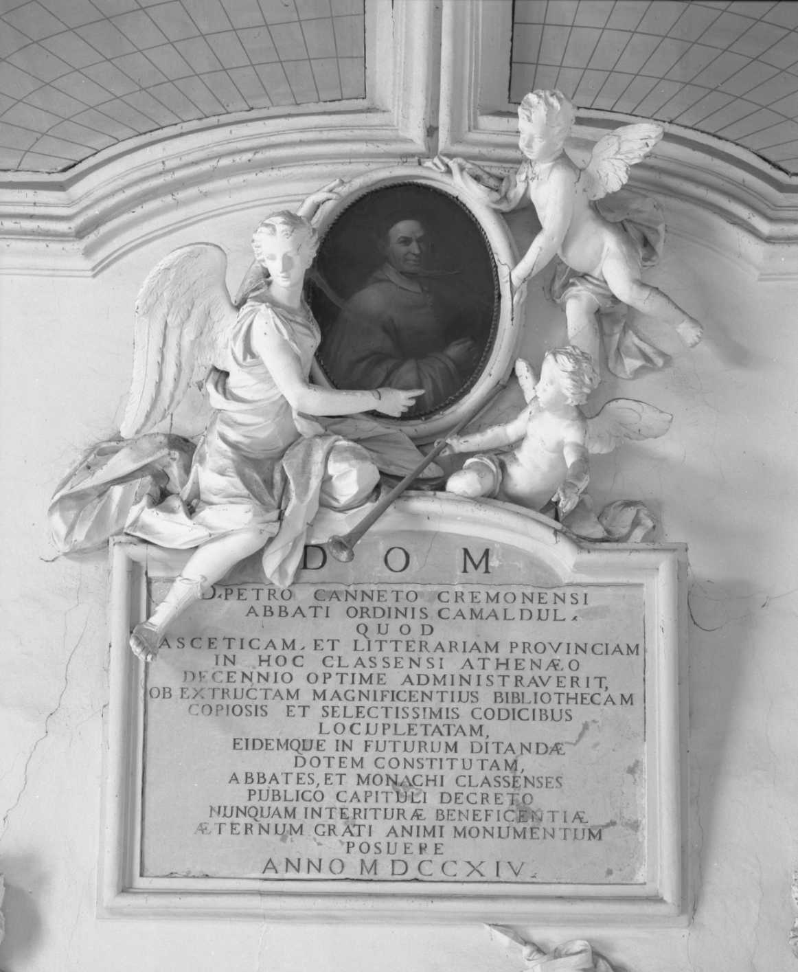 Il ritratto è compreso in un complesso in stucco ed epigrafe interamente dedicato all'Abate Pietro Canneti. La tela raffigura l'Abate visto per metà della persona, su fondo scuro col torso rivolto verso destra. La notevole altezza impedisce di leggere bene l'opera. Il personaggio è inserito entro una incorniciatura ovale in stucco sorretta da un grande angelo in stucco sulla sinistra e da un angioletto in stucco a destra. Un terzo angioletto in stucco regge una tromba.. Personaggi: Abate Pietro Canneti