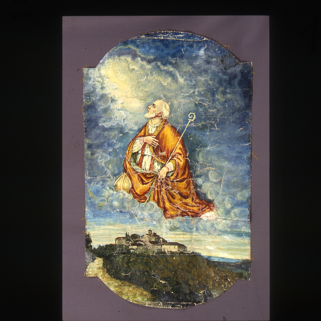 San Fortunato in estasi tra le nubi; sullo sfondo un colle con un convento (Covignano?)