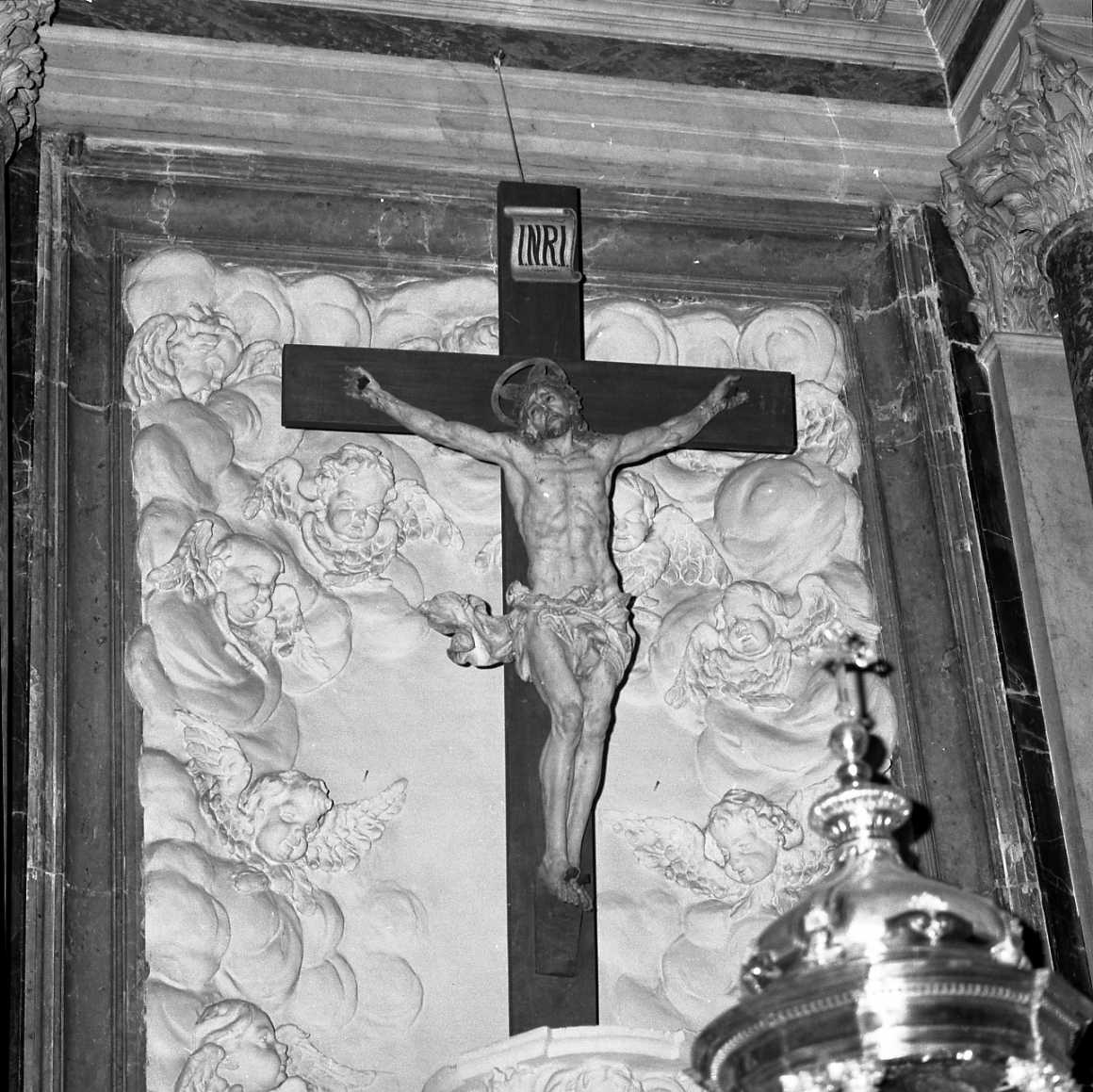 La croce, lineare, poggia su una mensola di stucco con tre teste di angelo inserite entro volute. La figura è in legno policromo. Particolare finezza si rileva nella resa dei particolari anatomici del Cristo: della barba, dei capelli e dell'espressione del viso. Il perizoma presenta ricche pieghe svolazzanti.. Personaggi: Cristo crocifisso. Attributi: (Cristo crocifisso) capo reclinato; barba; perizoma con ricche pieghe