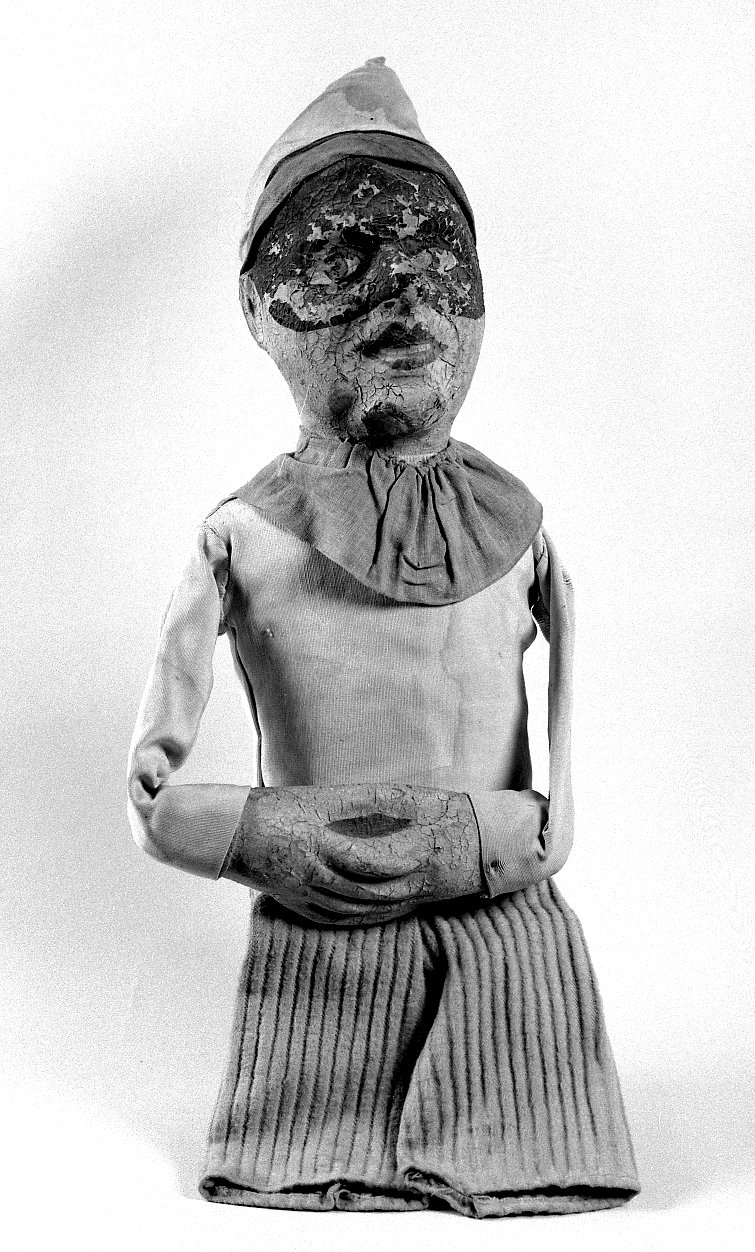 Figura realizzata sul modello di Pulcinella, di questi infatti mantiene la maschera. I pantaloni sono corti e in tessuto rigato.