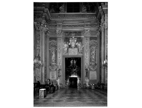 Due lesene con candelabre monocrome su fondo dorato affiancano la porta sostenendo l' alta trabeazione a motivi architettonici. Nei settori laterali si trovano le due nicchie con le sculture marmoree dei santi patroni di Ferrara mentre al centro, sulla porta, due angeli dipinti affiancano una lapide con lo stemma di papa Clemente XI.