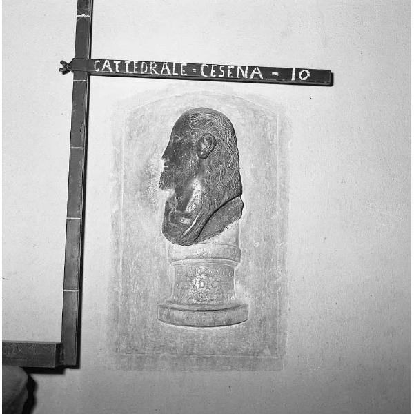 La figura del Cristo, in porfido è posta su una base semicircolare con scritta. E' posto di profilo, è visibile la parte sinistra del volto. Ha i capelli lunghi, tra i quali è modellato con precisione l'orecchio, e la barba folta. Nel bordo superiore della veste è inciso IHS.