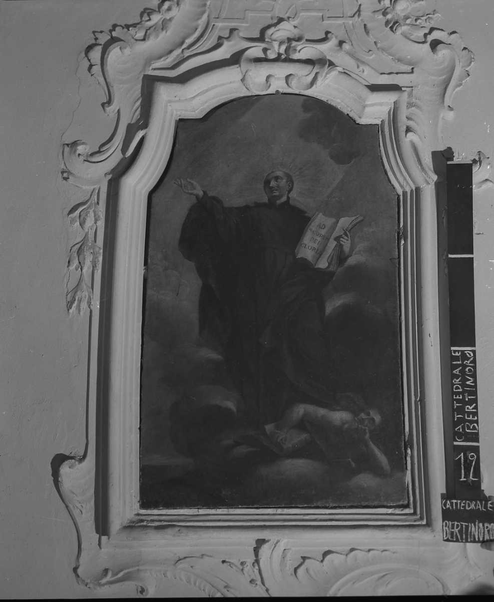 Il santo è in piedi con ampia tonaca nera. Con la mano sinistra tiene un grosso volume aperto su cui è la scritta: AD MAIOREM DEI GLORIA. Sotto i suoi piedi appare la figura a torso nudo di un demone. Centina superiore.