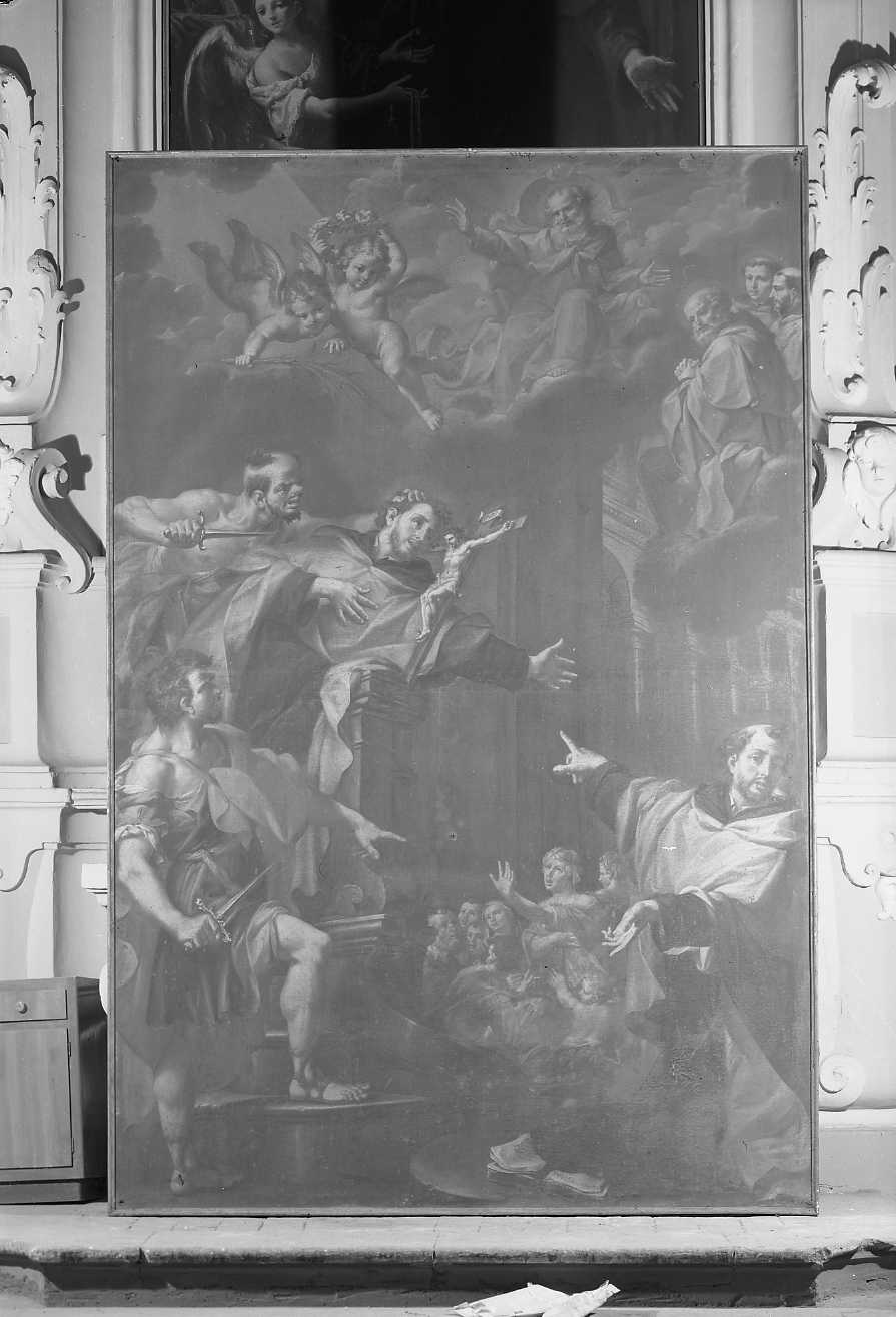 Ambientazione architettonica con fuga di colonne sulla destra; in alto il Padre Eterno compare tra nubi con due cherubini a sinistra ed alcuni Santi a destra; al centro e in basso folla; a destra Sant'Alberto confessore che indica il suo confratello Sant'Angelo, a sinistra, che sta per essere martirizzato da un carnefice; a sinistra in primo piano un soldato con una tunica azzurra.. Personaggi: Padre eterno; Sant'Alberto; Sant'Angelo. Attributi: (Sant'Angelo) crocifisso. Guerrieri