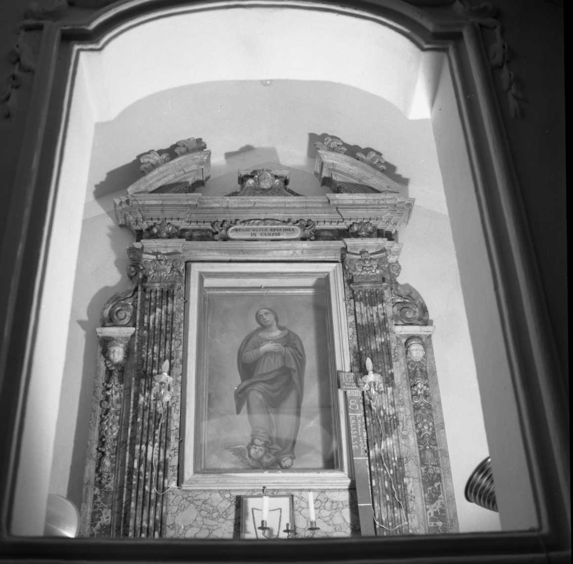 A figura intera, in piedi, frontale, il piede destro su una coppia di testine alate; le mani al petto. Ha veste rossa e manto azzurro. Sfondo di nubi giallognole sfumate in grigio.. Personaggi: Madonna Immacolata