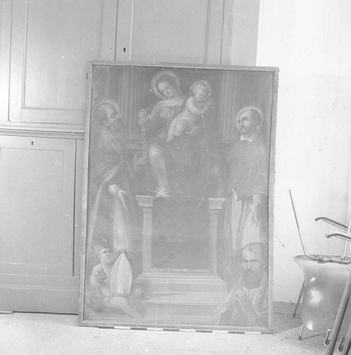 Su alto trono, inquadrato nel fondo da colonne scanalate, siede la Vergine che regge in braccio il Bambino nudo. Alla sinistra è in piedi S. Nicola da Bari, in atto di ricevere dalla Vergine il rosario; in basso un putto seduto regge le tre simboliche palle, il pastorale e la mitria. Alla destra, in piedi, è S. Carlo Borromeo, cui il Bambino porge un altro rosario. Alla destra in primo piano, in basso, un sacerdote a mezza figura orante rivolto all'osservatore (il committente).