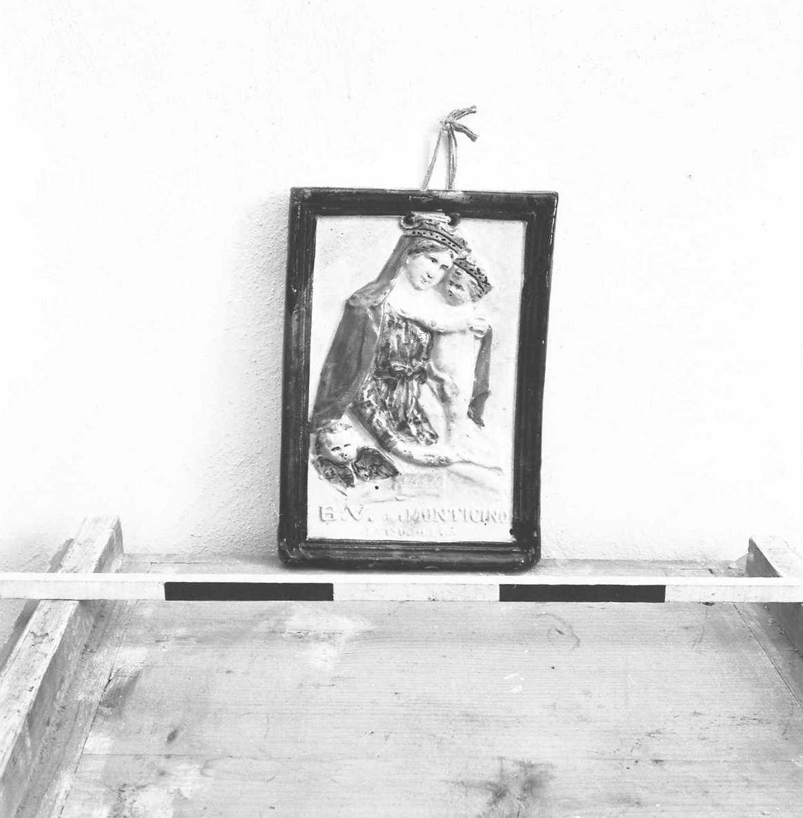 Mezza figura della Vergine, verso destra, con il Bambino nudo in piedi, a destra. Le teste sono coronate. In basso a sinistra testina di cherubino. Cornice dipinta.