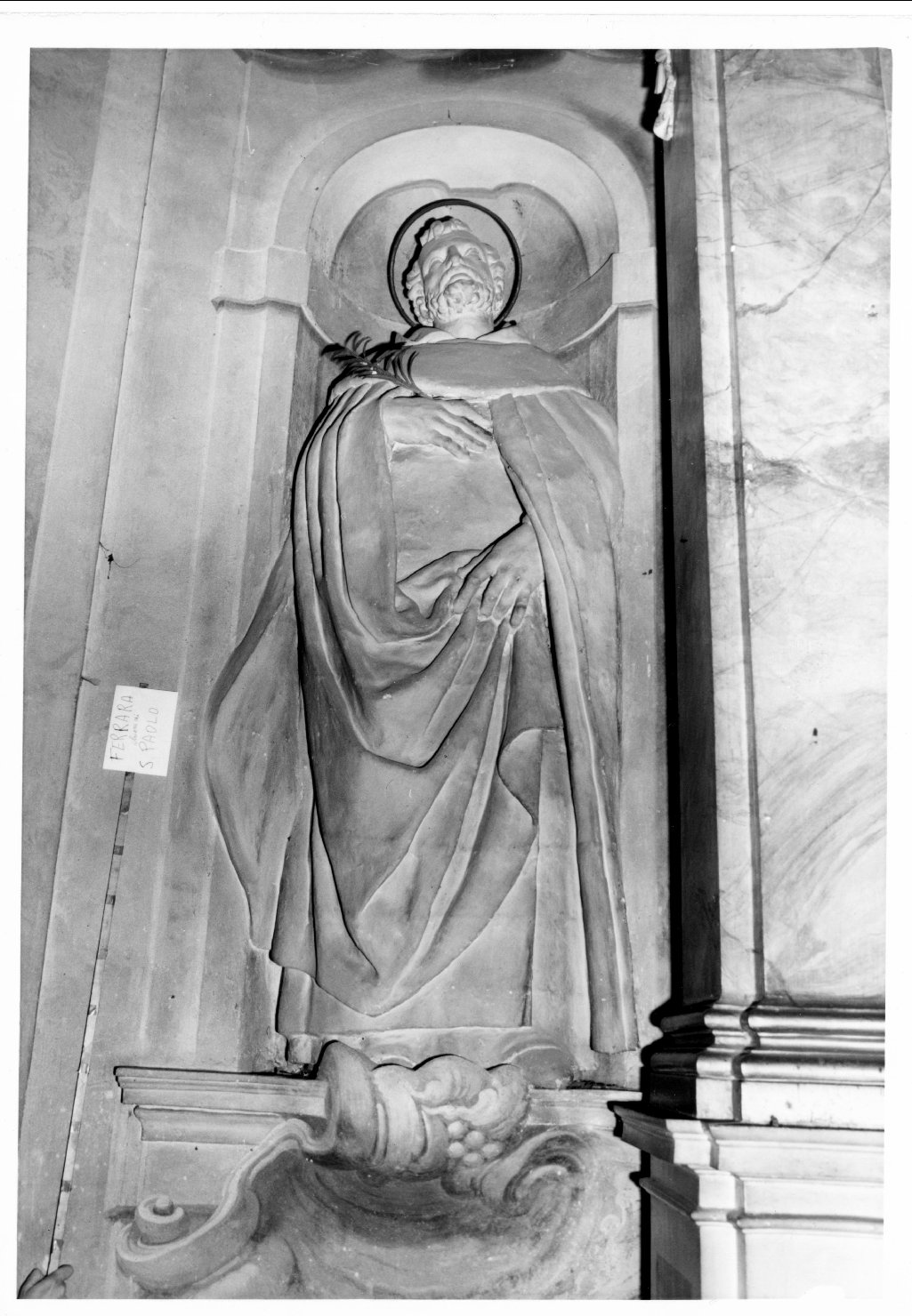 Figura intera, barbato, con lo sguardo rivolto verso l'alto. La mano destra al petto e la sinistra che regge il lembo di un mantello.