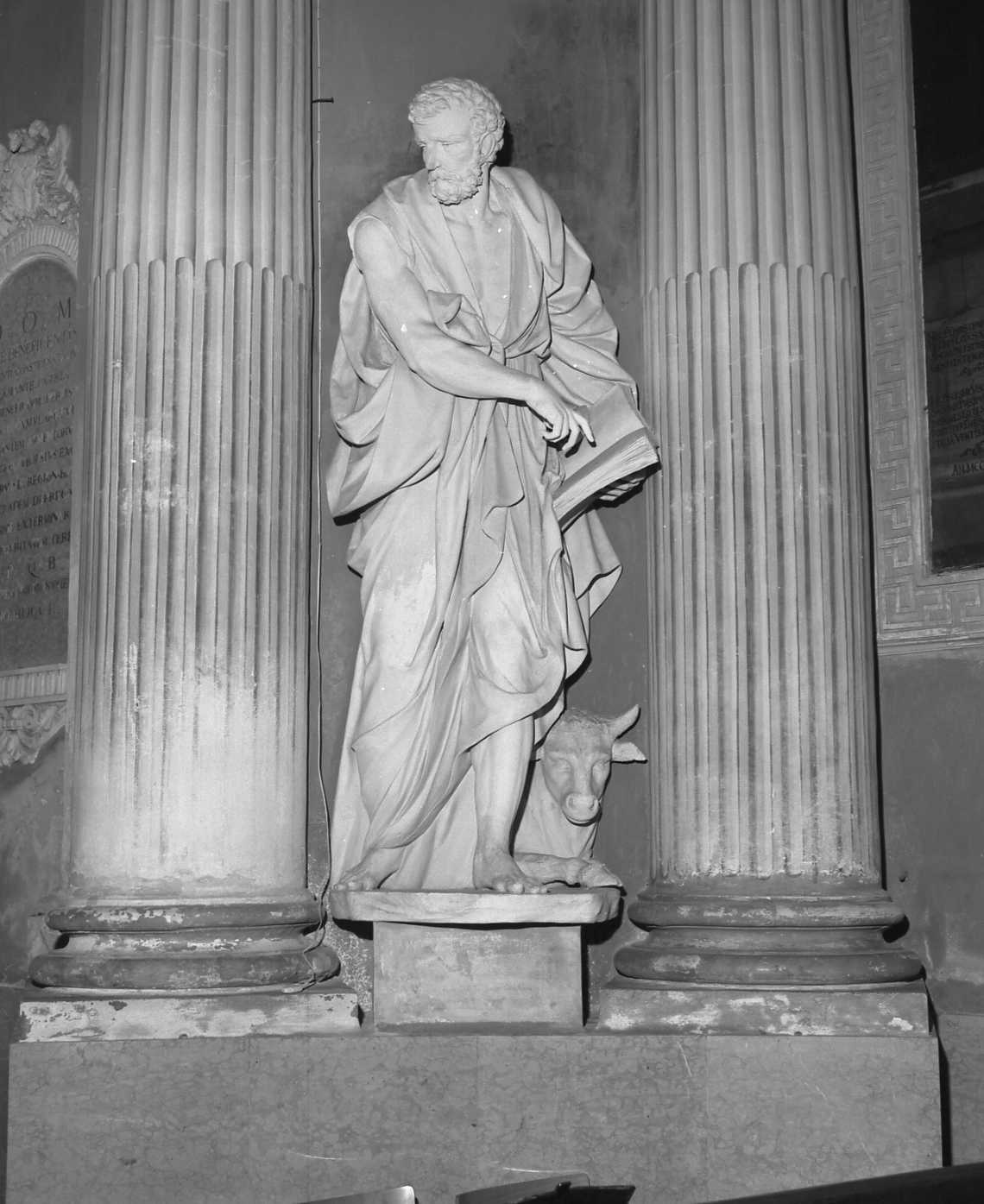 Statua a figura intera, in piedi. L'Evangelista, in atto di procedere, accenna col braccio destro, scoperto dal manto, al volume che tiene aperto sul fianco sinistro; volge di lato il volto pensoso dallo sguardo abbassato,. E' accompagnato dal vitello, sdraiato dietro di lui.