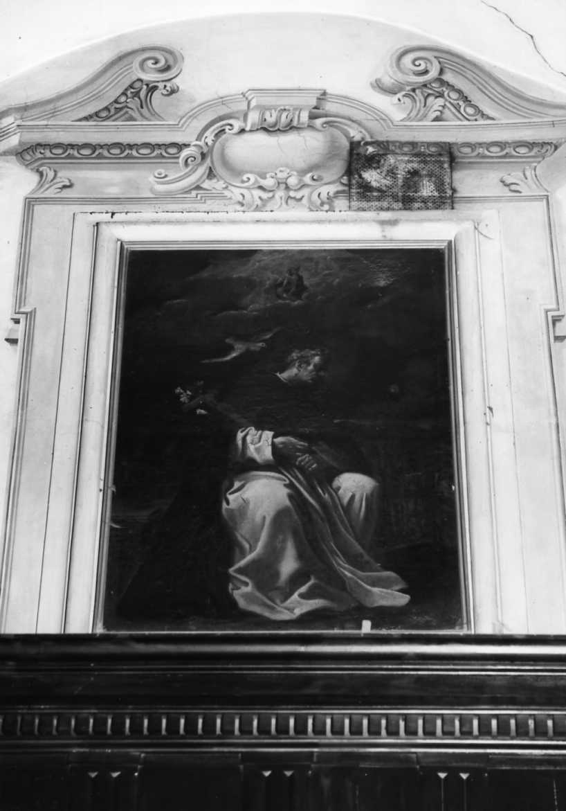 Figura intera seduta al centro verso destra, di profilo, indossante l'abito dell'Ordine, con Crocifisso alla destra, stretto con ambo le mani. Dietro il capo del Santo, dall'alto a sinistra, scende una colomba. Nello squarcio centrale in alto, fra le nubi, appare un angelo. Fondo scuro.
