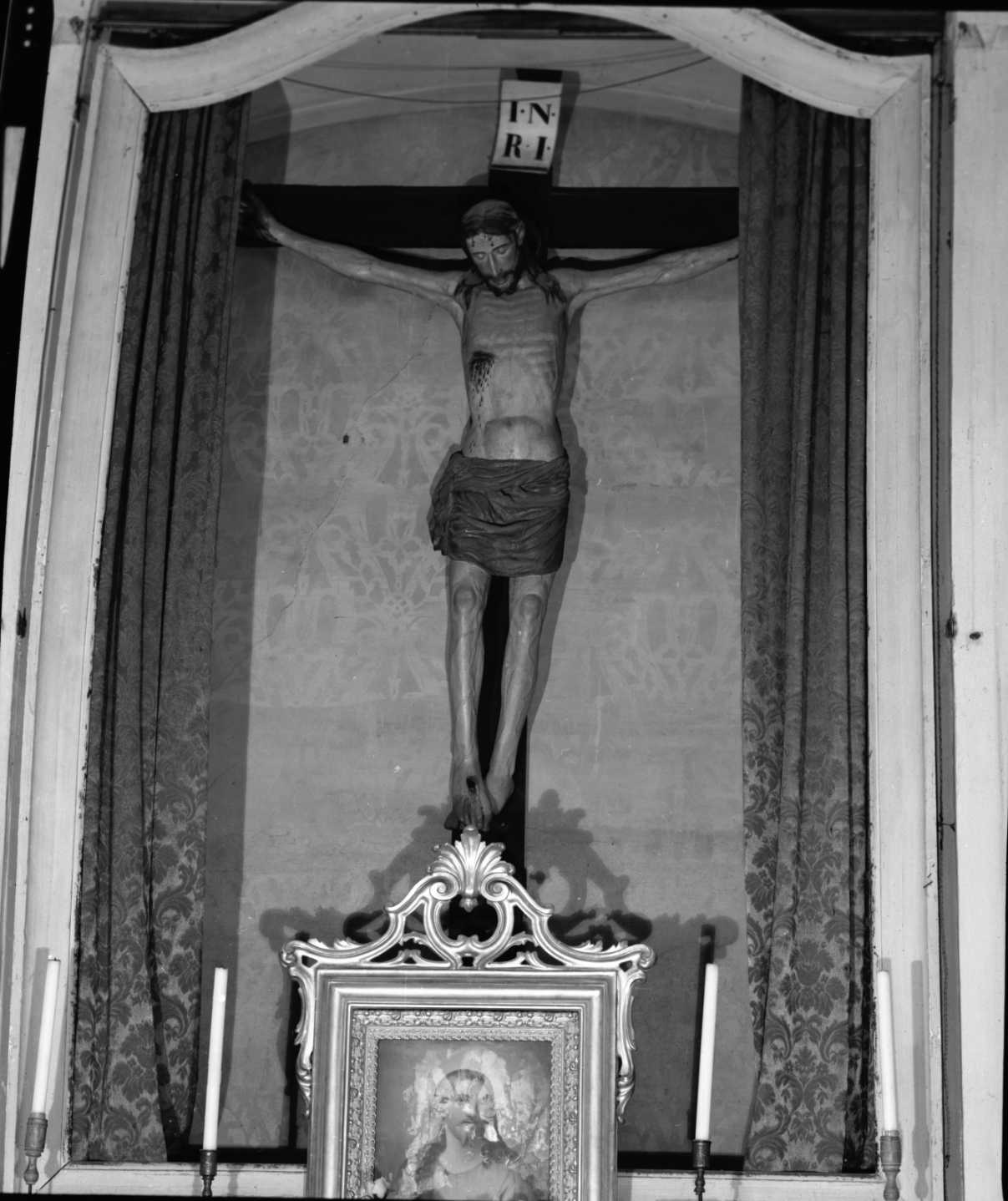 Il Cristo crocifisso è scolpito in legno in atteggiamento composto e tiene la testa leggermente reclinata in avanti sull'omero destro. E' cinto da un ampio perizoma annodato sul fianco destro, ha i piedi giunti, trafitti da un unico chiodo e sanguinanti. E' anatomicamente corretto, per quanto di senso plastico un po' duro e freddo. E' coperto da uno strato di tempera color rame, comune copertura delle sculture lignee che ha la funzione di isolarlo dall'aria e di renderlo piu' simile al vero.. Personaggi: Cristo Crocifisso. Attributi: (Cristo) testa reclinata; perizoma ampio; piedi giunti e sanguinanti; corona di spine