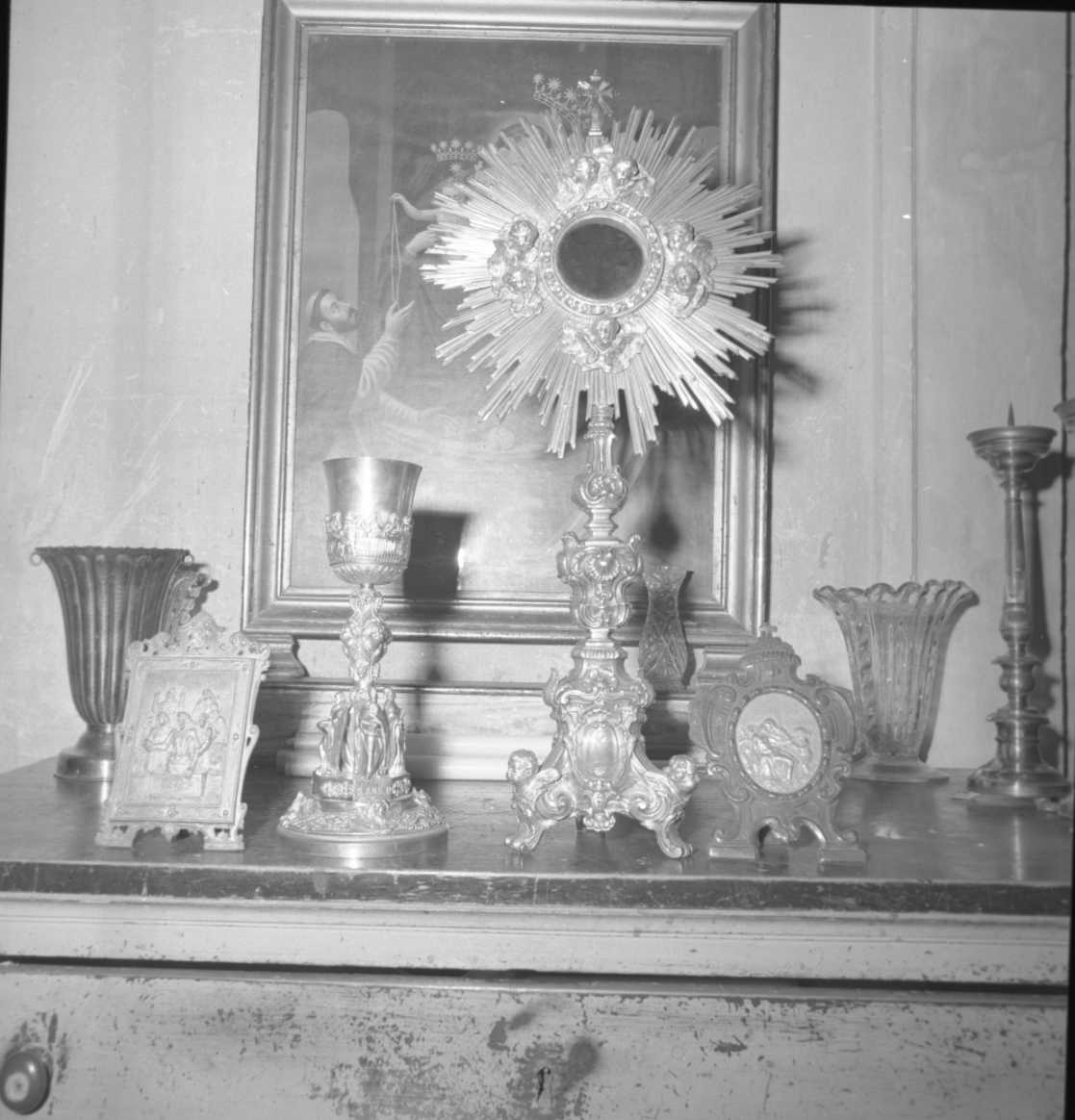 Sulla piccola lastra di metallo lavorata a sbalzo sono state saldate le teste a tutto tondo. E' rappresentato il Cristo, di tre quarti, che esce dal sepolcro sorretto da due angeli. Dietro di Lui, due "pie donne", una delle quali sembra la Maddalena. La cornice, dello stesso metallo è anch'essa argentata, è cesellata e ha nella parte superiore una cimasa con volute e motivi fogliacei.