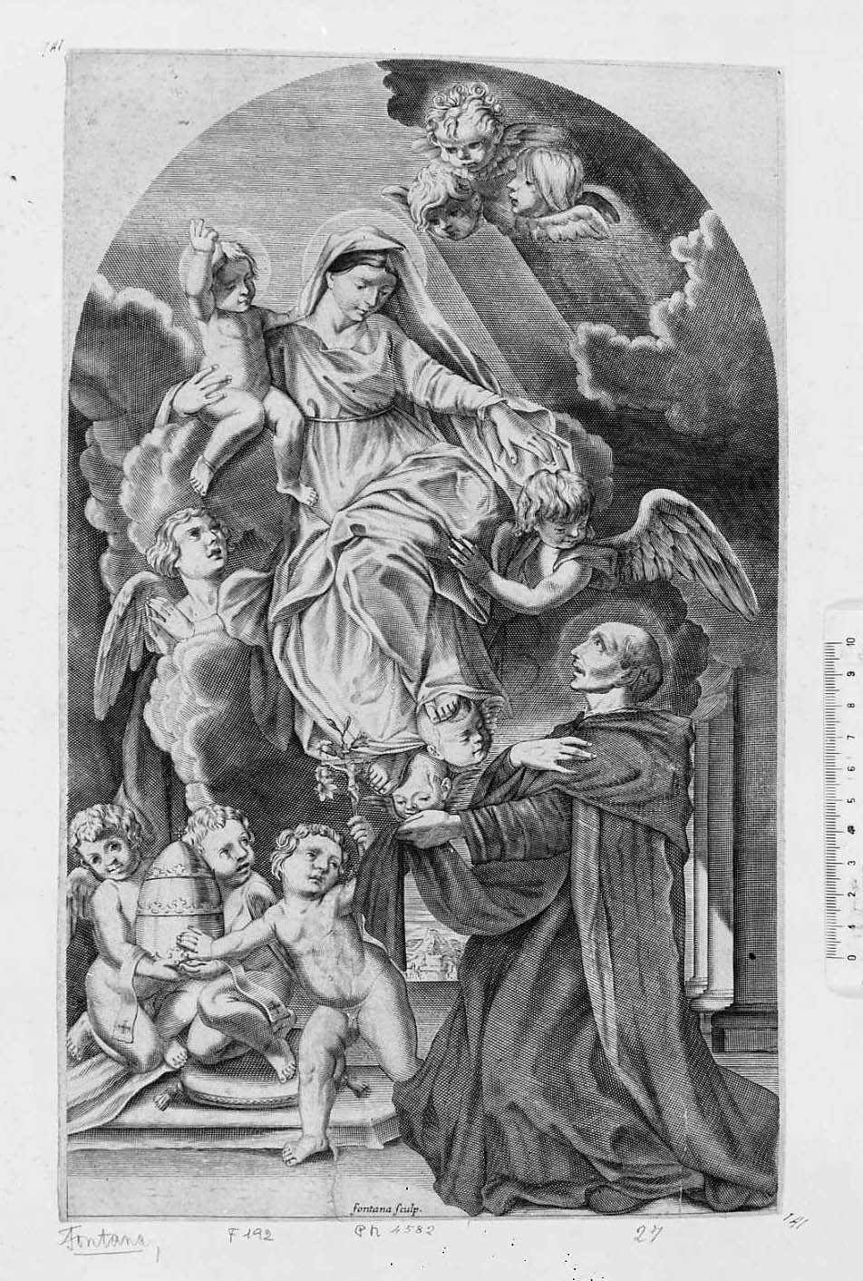 Vergine con Bambino, angeli e santo frate. (stampa tagliata)