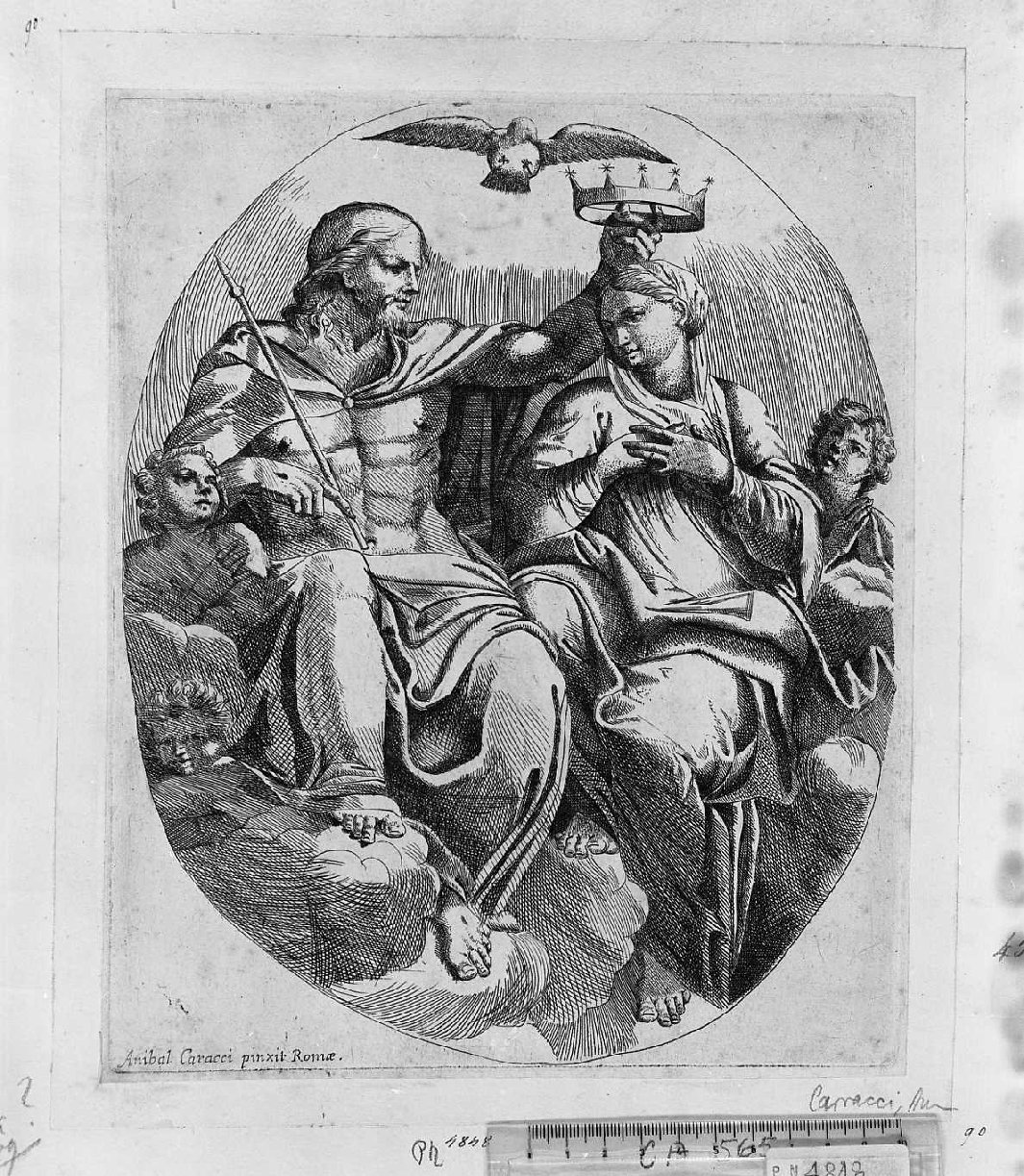 Personaggi: Madonna; Gesù Cristo; angeli. Allegorie-simboli: (Spirito Santo) colomba. Oggetti: corona