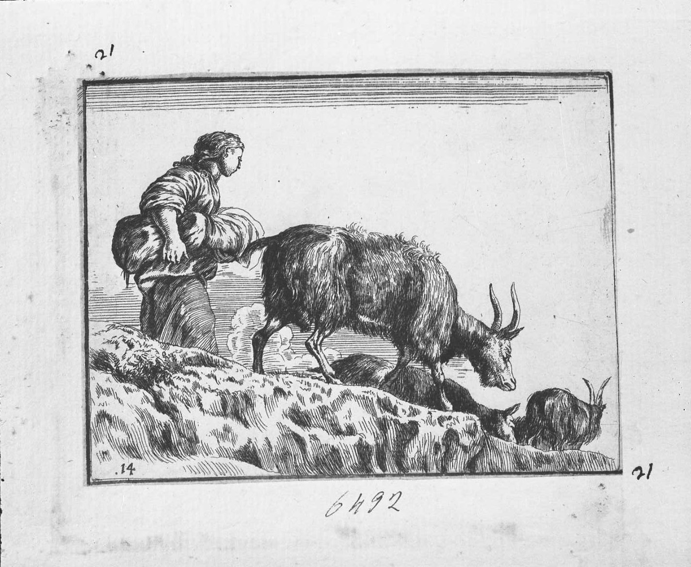 Animali e soggetti di caccia: capra volta seguita da una fanciulla (copia in controparte), animali (stampa tagliata)