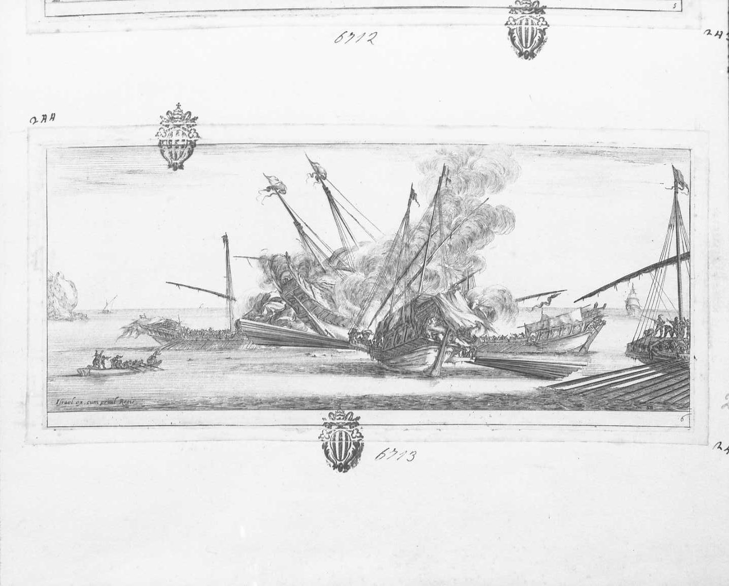 Diversi disegni sia per la pace che per la guerra: combattimento navale, attività umane (stampa tagliata)