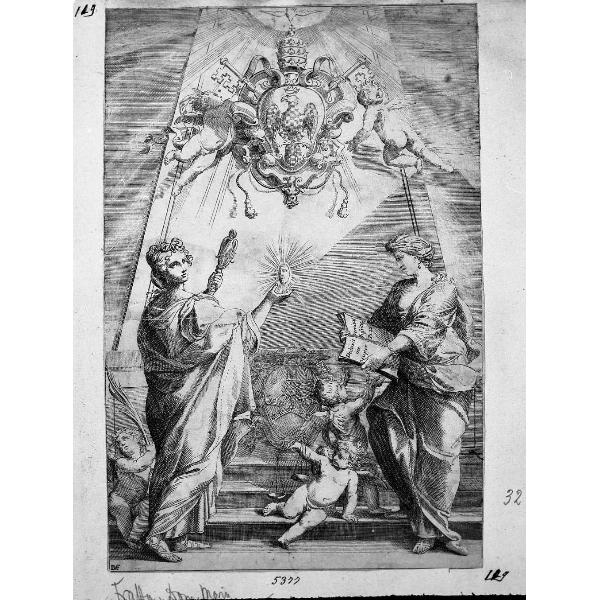 Prudenza e Giustizia e stemmi di Innocenzo XIII e Alessandro Dolfi, allegoria della Giustizia (stampa tagliata)