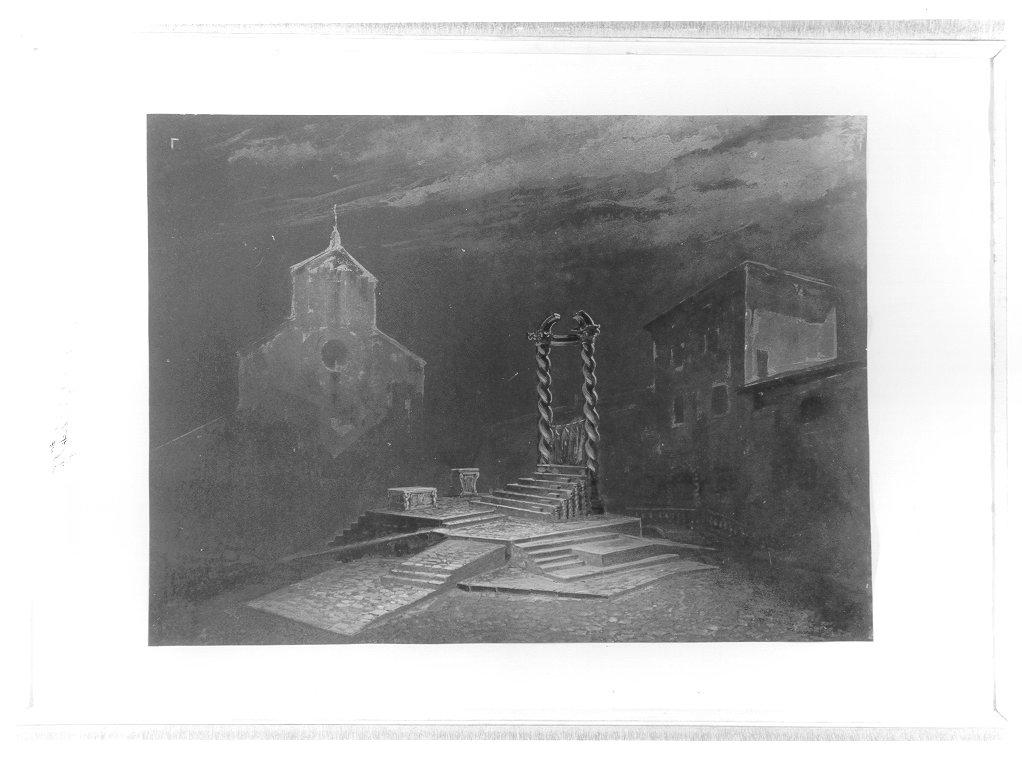 Scenografia su fondo azzurro.. Elementi architettonici: facciata di chiesa; facciata di palazzo. Oggetti: altare; sedile; scalinate; colonne tortili con arco spezzato