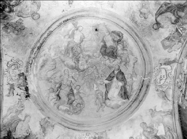 Dipinto murale. Trinità con Santa Giustina e San Cipriano martire.