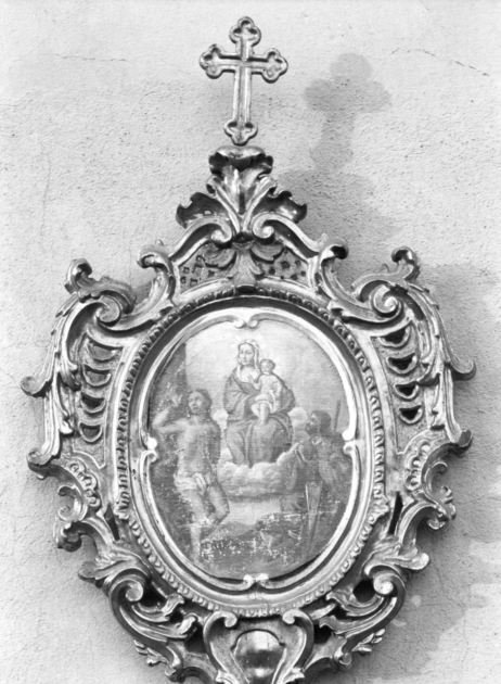 Mostra ovale con cornici modanate e a ovuli affiancate da fregio a volute efoglie con palmetta e croce trilobata all'apice. Recto: Dipinto raffigurante Madonna con Bambino in trono tra santi Rocco e Sebastiano. Verso: santo vescovo martire e altro santo.