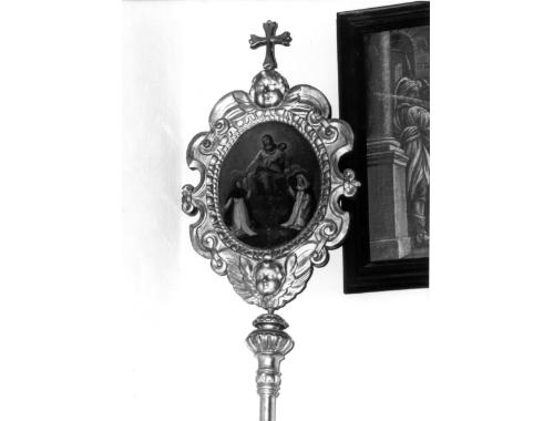 Insegna processionale con cornice mistilinea ornata da due teste di cherubino, in alto e inbasso al centro, da volute annodate e da crocetta apicale. La tavoletta ovaleraffigura la Madonna del Rosario con San Domenico e Santa Esterina (?) inginocchiati. Bastone con nodo piriforme.