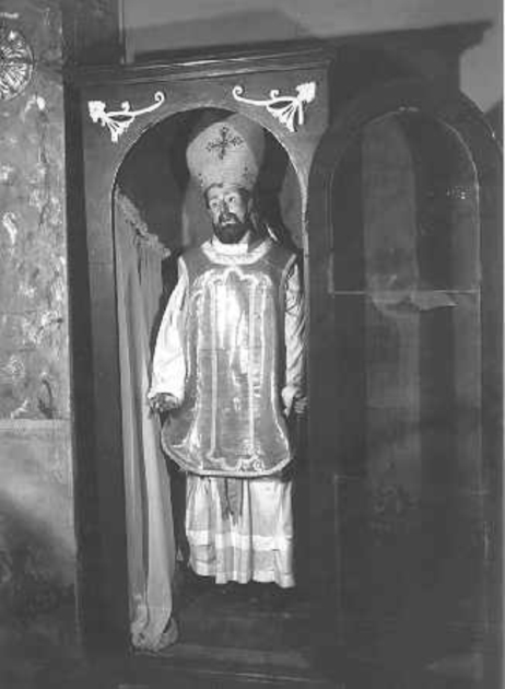 Statua vestita con camice, pianeta, mitra e pastorale, inserita in una urna di legno. Il camice, in tela di lino bianco, con pieghe in fondo. La pianeta , laminata in oro con gallone in argento filato e oro filatoe lamellare. La mitra ha decoro a onde e disegno a ricamo in oro filato e lamellarecon applicazione di pietre colorate. L'urna, molto semplice, dipinta in marronecon decoro a volutine in smalto bianco; sportello in vetro stondato in alto.