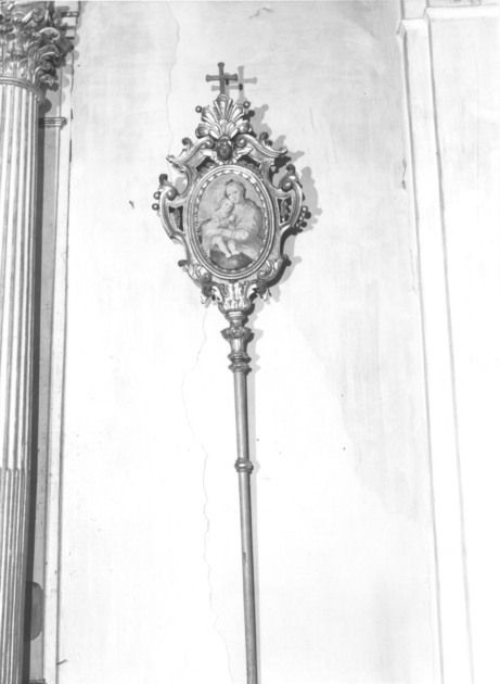 Insegna processionale. Targa sagomata a volute vegetali perlinate con ventaglio di foglie su cherubinoalla sommità, tabella figurata con cornice ovale modanata e cornice internaad archetti, crocetta apicale.