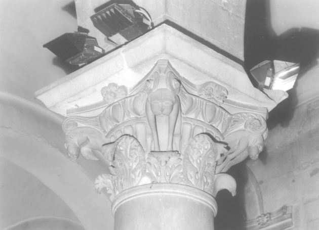 Il capitello presenta una figurazione complessa, impostata su un giro di foglie individuate come di quercia dalla presenza di ghiande (alcune foglie sono lisce, forse non compiute), sovrapposte ad una decorazione a solchi, come una baccellatura. Negli angoli quattro animali, per i quali resta in dubbio una precisa identificazione: potrebbe trattarsi di scimmie, ma ad un'osservazione attenta si è portati a scorgervi dei leoni o, meglio, delle pantere, disegnate secondo il tipo 'orientaleggiante' (di ambito pisano della metà del secolo): acquattate, dalle lunghe e sottili zampe anteriori, il muso dai tratti assai stilizzati (occhi a mandorla privi di pupille, lungo naso, baffi arricciati, indicati da semplici striature), criniera a sottili solchi paralleli, scriminata al centro, piccole orecchie appuntite. Le fiere sono sovrastate da volute di vario tipo, e da una fascia ad ovuli. Al centro delle facce, in alto, elementi floreali singoli o a coppia.. Animali: pantere