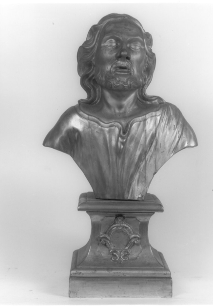 su base trapezoidale, modanata e a fondo liscio, includente al centro unacartella a volute; il santo è a tutto tondo. Personaggi: santo