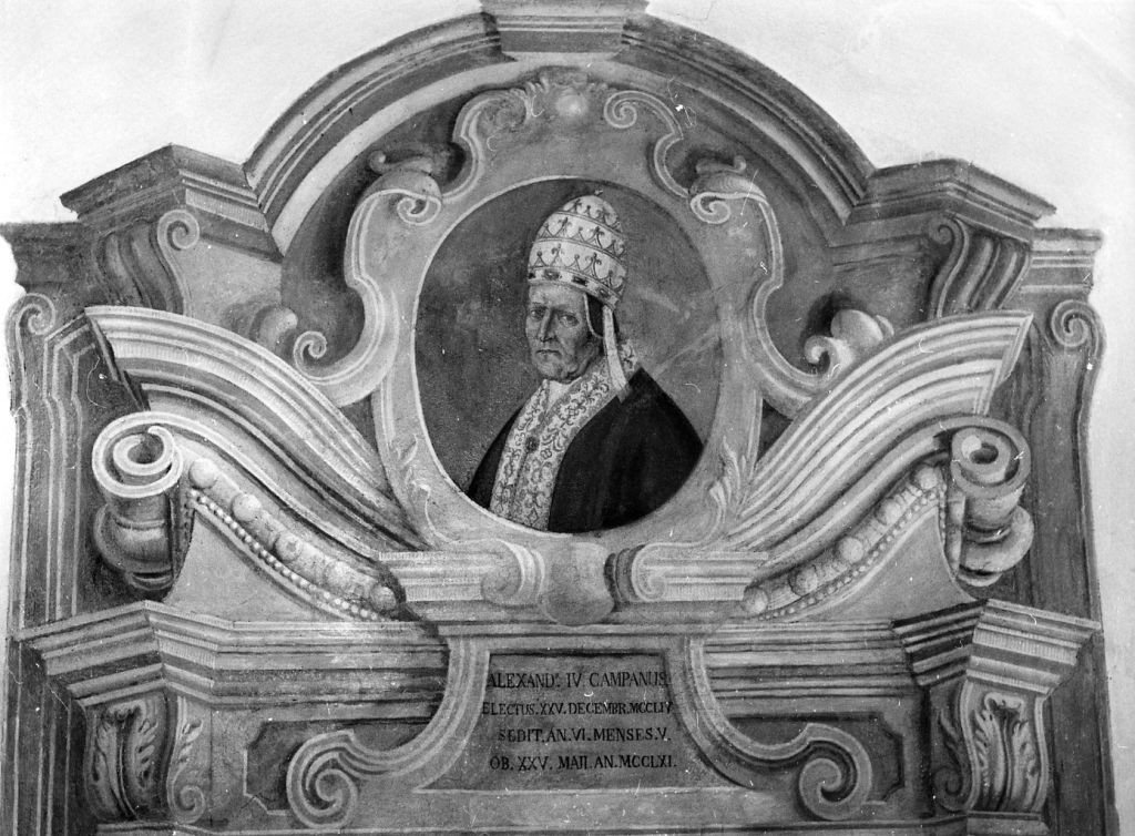 Affresco policromo raffigurante papa Alessandro IV entro un medaglione. Il ritratto è inserito nel sovrapporta decorato con quadrature che fingono complessi frontoni curvilinei aggettanti e sovrapposti, ornati da cornici ad ovoli e fogli d'acanto. La decorazione prosegue in basso a formare gli stipiti della porta.