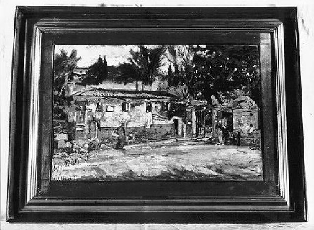 L'opera, con cornice modanata in legno dorato, è una sorta di abbozzo di grandi dimensioni: raffigura una villa - a sinistra - con cortile in primo piano animato da un cavallo al barroccio e da una figura umana. A destra, in secondo piano, subito accanto al barroccio, si trova il cancello della villa (il cui pilastro è decorato al sommo con la statua di un cane), oltre il quale è posto, di nuovo a destra, un casottino di forma cilindrica sormontato da un tetto a cupola. Sullo sfondo l'alta vegetazione costituisce una macchia scura contrapposta alle tonalità chiare - arancioni e grigi - che caratterizzano il cortile della villa e l'abitazione stessa. A sinstra, sempre sullo sfondo tra le fronde degli alberi si intravede un casolare. Il cielo azzurro è coperto di nuvole bianche su cui su staglia il verde della vegetazione che sfuma ai lati i colori arancione e marrone.