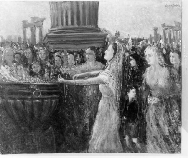 Dipinto ad olio su tavola raffigurante una folla di donne che si accalcano attorno ad un braciere ove depongono i propri ori. Tra le donne si vedono alcuni bambini in veste da balilla e, sullo sfondo, numerose rovine. Colori: azzurro, grigio, giallo, rosso.