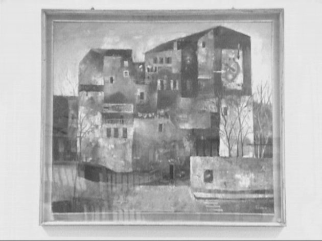 Il dipinto raffigura un agglomerato di case vecchie in un contesto moderno, con strada asfaltata e strisce pedonali in primo piano.