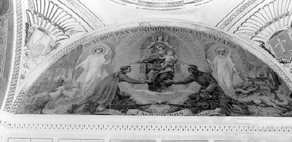 Al centro della lunetta vi sono raffigurati due soldati, un italiano ed un austriaco, che si danno la mano sotto lo sguardo benevolo della Madonna in trono con il Bambino. A destra un angelo con la lancia scaccia un drago, simbolo della guerra; a sinistra, un angelo guida alcuni agnelli, simbolo di pace.