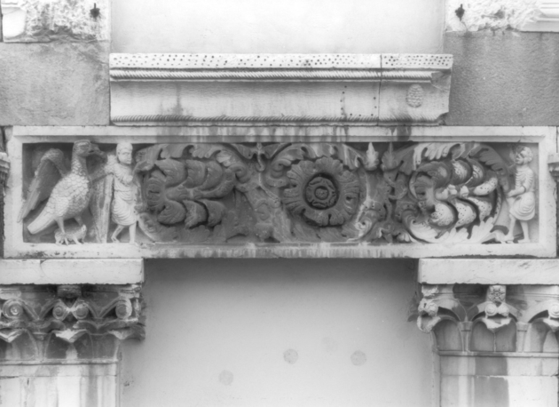 L'architrave, delimitato da una cornice liscia, presenta due figure virili reggenti un tralcio di foglie che si sviluppa in tre girali: una corolla in quello centrale e cespi di foglie come di felce negli altri. All'estremità sinistra un'aquila stringe nel becco una preda, sovrastando un altro animale. Figure: figure maschili. Animali: aquila; due prede. Vegetali: tralcio di foglie