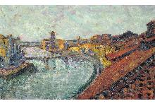 Veduta dalla riva di mezzogiorno del Ponte a Mare durante una manifestazione folcloristica. Nel fiume sono disposte in line a quattro imbarcazioni pronte a sfidarsi. In primo piano sono un gruppo di piccole imbarcazioni.
