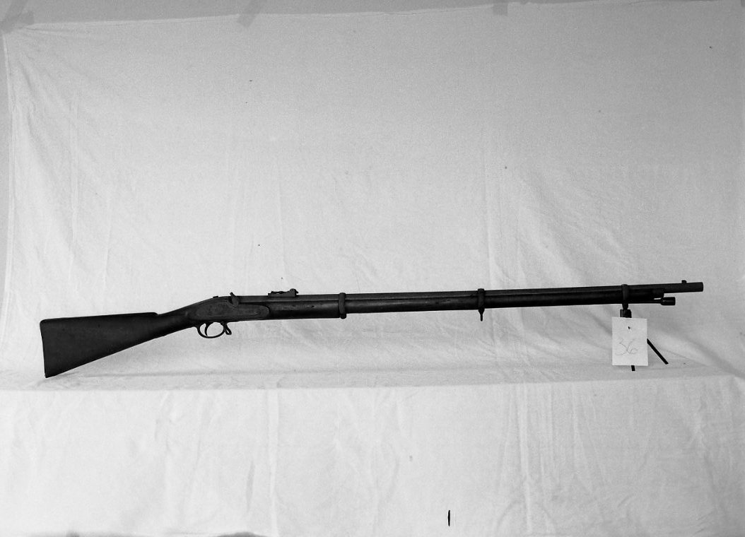 fucile da fanteria Mod. 1858, canna esternamente tonda spianata superiormente in prossimità della culatta. Alzo mobile graduato salfato alla canna, mirino saldato alla canna in prossimità della volata. Bocchino in ottone; seconda, terza e quarta fascetta in ferro; sia alla seconda che alla terza fascetta sono articolate delle magliette portabretella, una terza è articolata anteriormente al paragrilletto. Ponticello e calciolo in ottone. Cartella molla avanti profilata da filettatura; due rosette in ottone fermano le teste delle viti della cartella al posto della controcartella. Corpo del cane brunito e profilato da una filettatura che, nella testa, diventa un ramo le cui foglie sono rivolte verso il basso; cresta zigrinata anteriormente