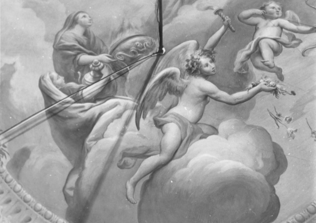 L'intelaiatura architettonica è formata da una apertura circolare bordata di un massiccio cornicione, sorretta da mensole e da finte vele; il tetto organizzato secondo l'arte del trompe-l'oeil. Nel riquadro centrale, sospese fra le nubi sono cinque Divinità mitologiche; agli angoli entro ghirlande dorate quattro busti classici; entro le vele e negli spazi fra le nuvole sono raffigurati, rispettivamente, strumenti musicali, strumenti scientifici, armi deposte e i simboli della pittura e poesia.