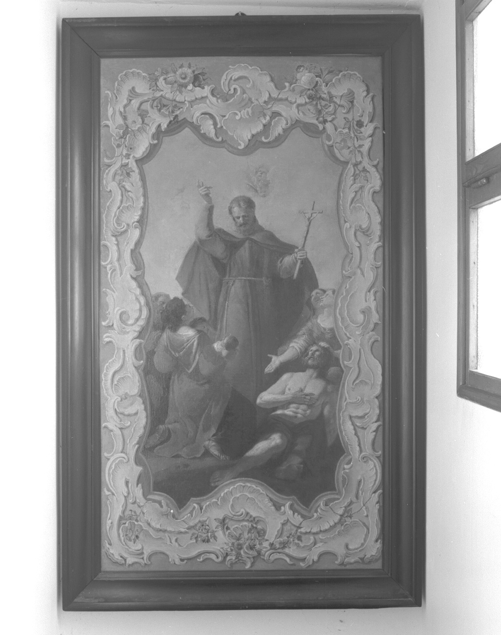 Cornice modanata in legno scuro. La scena è contornata da una cornice rococò dipinta a volute, girali, cartigli. Personaggi: Padre Marco d'Aviano'.'Figure: fedeli; madre con bambino in braccio; figure femminili; ammalato'.'