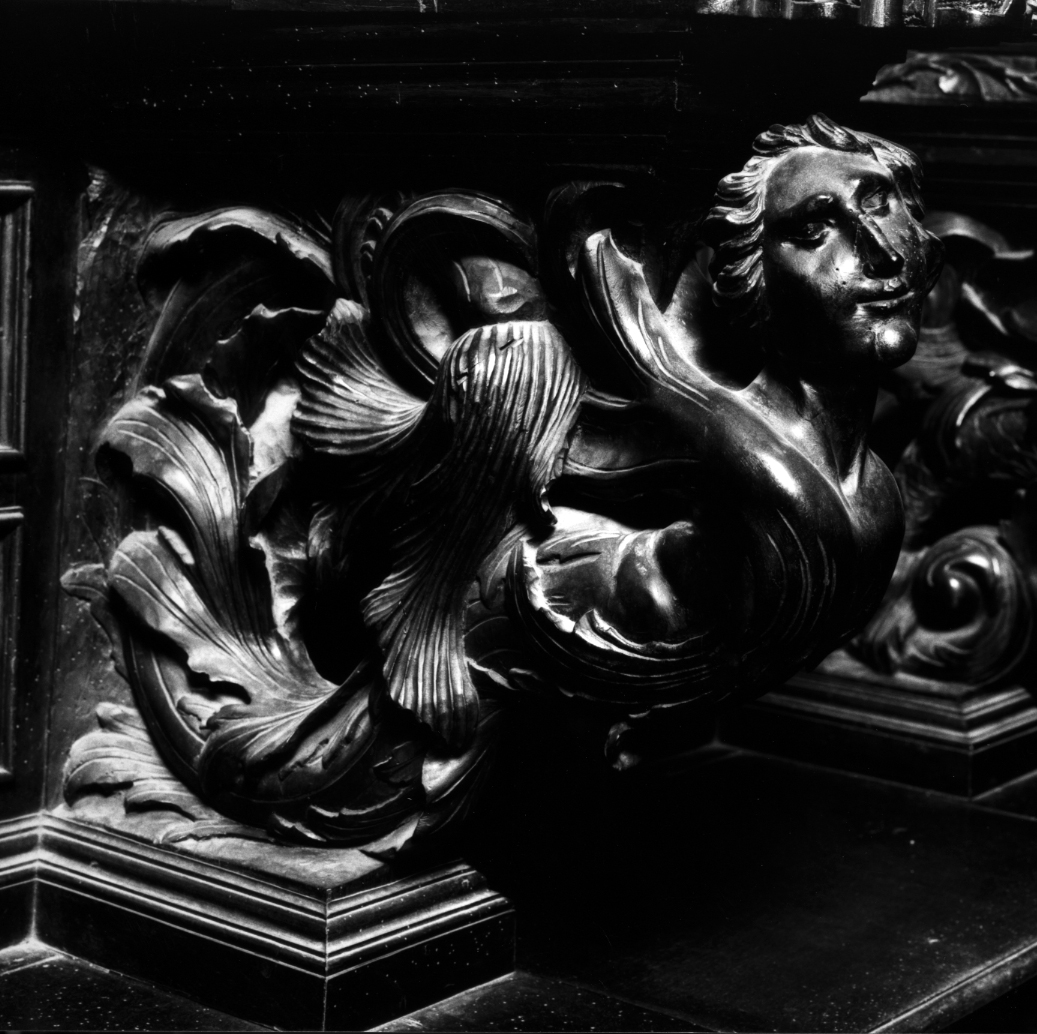 Busto maschile con testa rivolta verso la propria destra. Petto coperto di foglie d'acanto. Le ali appena abbozzate si aprono in una serie di motivi decorativi fitomorfi. Il tronco terminante a pesce decorato a volute fitomorfe.
