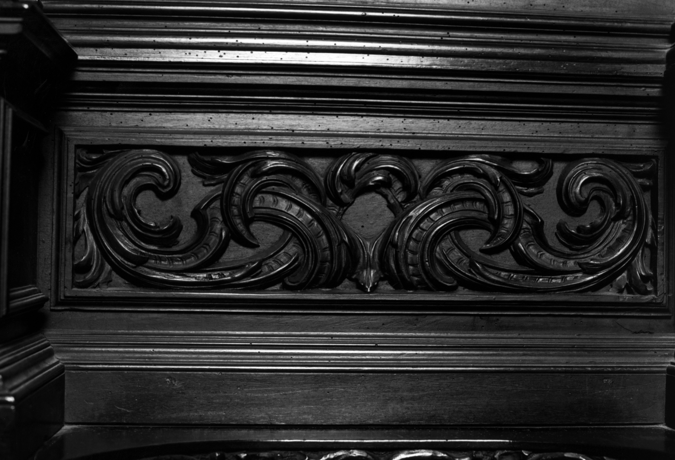 Decorazione disposta su di un asse di simmetria centrale con volute a nastro intrecciate con foglie.