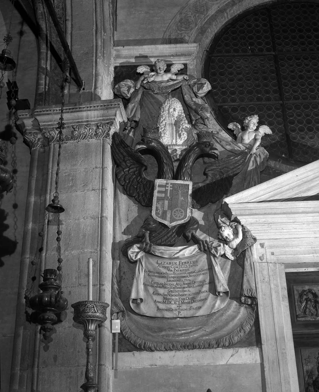 Monumento funebre costituito da aquila bicipite con stemma e cartiglio sormontata da busto. aquila bicipite/ putti/ Lazzaro Ferro