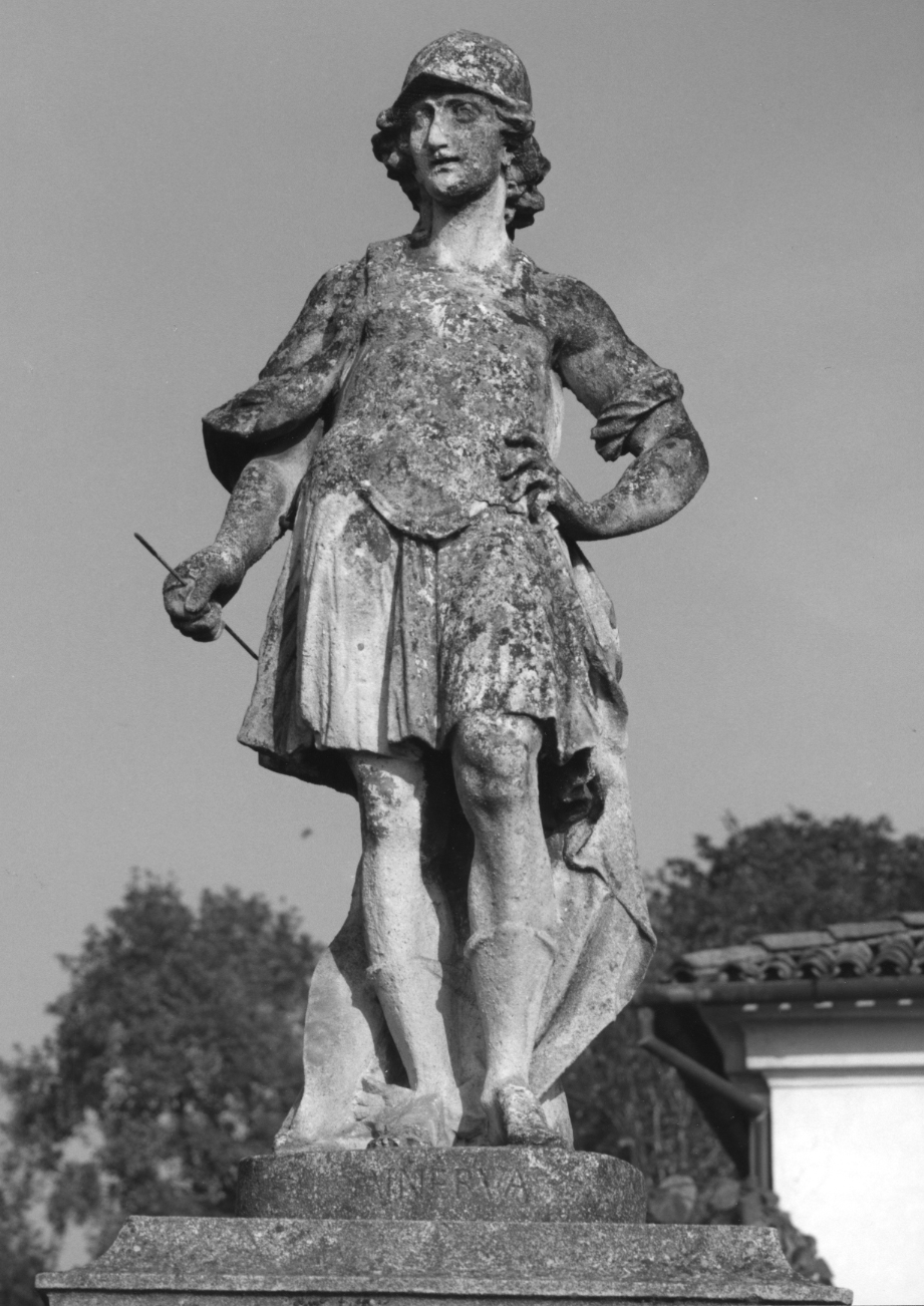 BASE: CIRCOLARE. MINERVA: FIGURA ERETTA; GAMBA DESTRA RIGIDA RETROSTANTE ALLA SINISTRA LEGGERMENTE FLESSA; BRACCIO DESTRO ALLUNGATO IN AVANTI E SINISTRO PIEGATO SUL FIANCO; IL VOLTO E' RIVOLTO A DESTRA. PORTA ALTI CALZARI AI PIEDI, UNA VESTE TERMINANTE A GONNELLINO, UN ELMO SUL CAPO E UNA FRECCIA DI RAME NELLA MANO DESTRA.. Divinità: Minerva