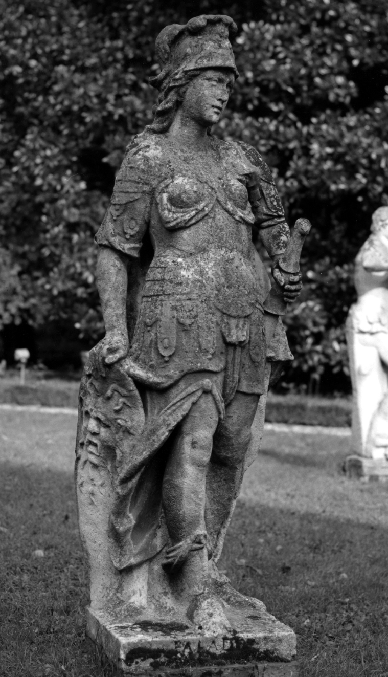BASE QUADRATA. FIGURA ERETTA STANTE CON GAMBA DESTRA AVANZATA E SINISTRA INDIETREGGIATA; LA MANO DESTRA SORREGGE UNO SCUDO, APPOGGIATO IN PIEDI ALLA BASE DELLA SCULTURA, CHE PORTA SCOLPITO UN VOLTO DALL'ESPRESSIONE SERIA; LA MANO SINISTRA IMPUGNA UNA SPADA. LA TESTA, RIVOLTA LEGGERMENTE A SINISTRA, PORTA UN ELMO. LA FIGURA INDOSSA UNA CORAZZA.