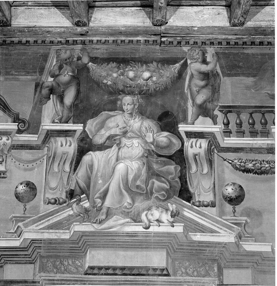 La donna, con vesti violacee, oro e bianche e con cinto verde, si porta una mano al petto e propende l'altra aperta; tale atteggiamento e il cane dipinto ai suoi piedi fanno ritenere trattarsi di una raffigurazione della Fedeltà.. Figure: Fedeltà