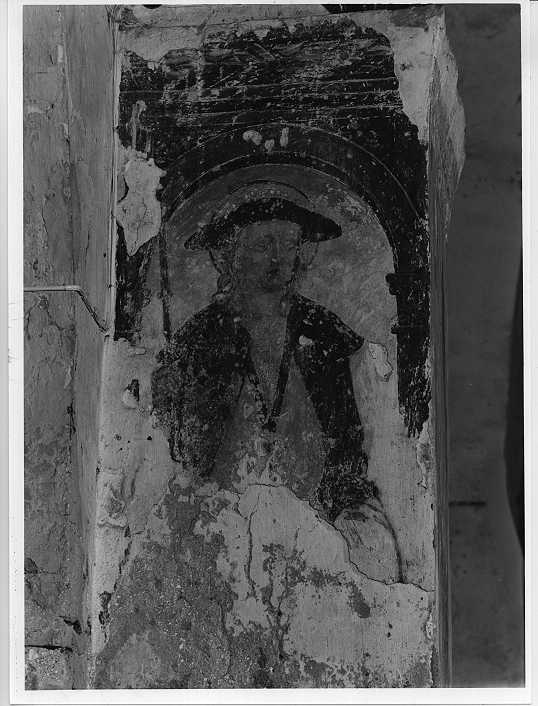Il dipinto raffigura un santo pellegrino sotto un arco sostenuto da colonne. Il santo porta il cappello e la cappa da pellegrino e si appoggia ad un bastone con la mano destra. Per la mancanza totale della parte inferiore dell'intonaco è impossibile stabilire se si tratti di un San Rocco.. Personaggi: Santo pellegrino