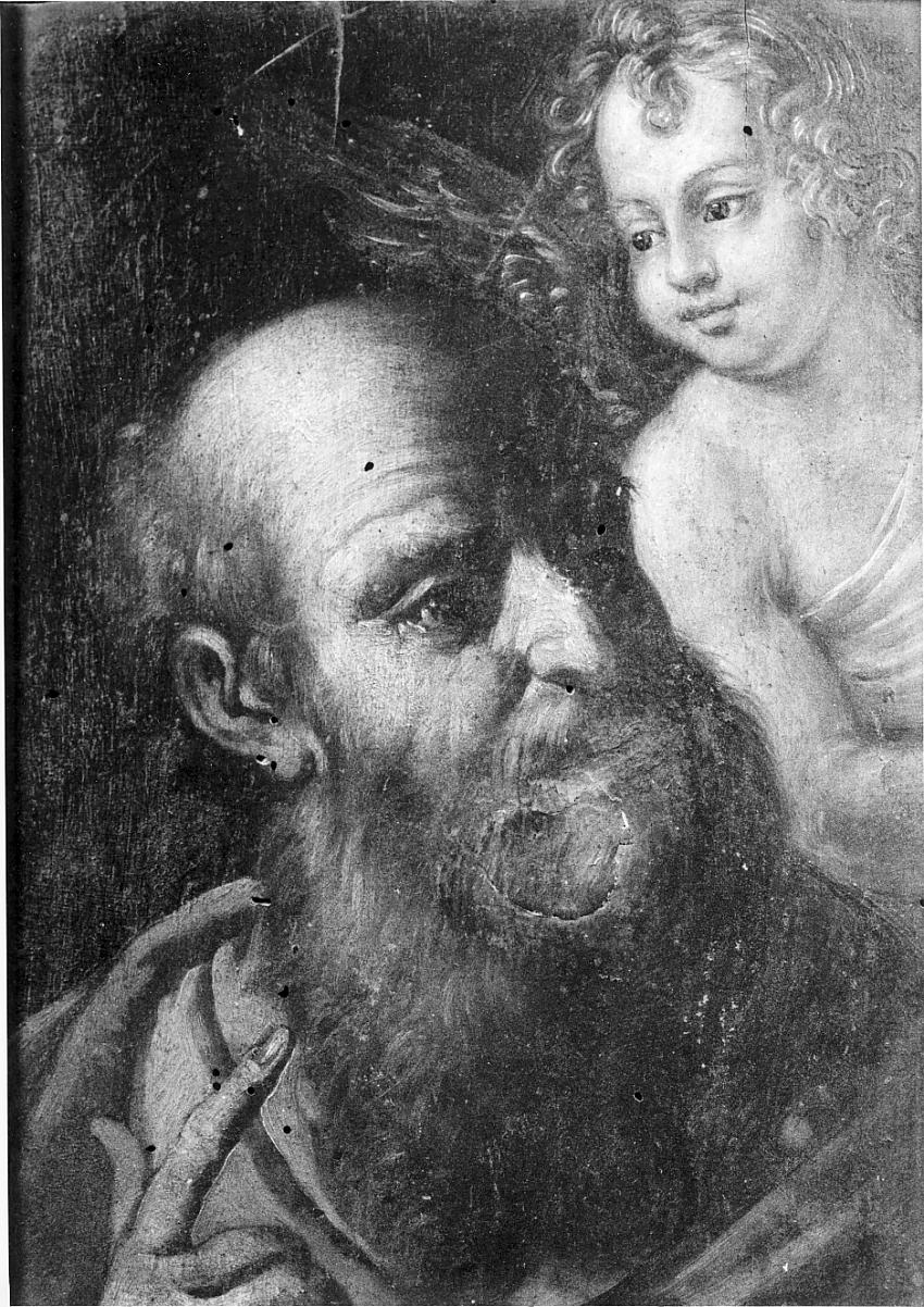 Personaggi: San Matteo. Attributi: (Santo) rappresentato frontalmente; a mezzo busto; volge il viso a destra alzando lo sguardo; alla calvizie fa contrasto una barba fluente e folta; con l'indice della mano destra accenna all'angioletto; suo simbolo distintivo che compare a mezzo busto nella parte destra del dipinto